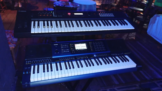 Dentro dessa banda, o instrumento principal é o Yamaha MX61, que contém todos os programas necessários para a maioria do repertório, contando com diversos timbres de pad, sintetizador, dentre outros. Ele também executa algumas trilhas, quando a música pede. Os dois Casio servem como instrumentos de apoio - o WK-6600 me fornece eventuais timbres de cordas e piano com chorus, enquanto o CT-X5000 complementa a programação do MX61 caso sejam necessários mais timbres que os suportados pelas zonas deste último (em outras palavras: se necessários três ou mais timbres ao mesmo tempo na mesma música).